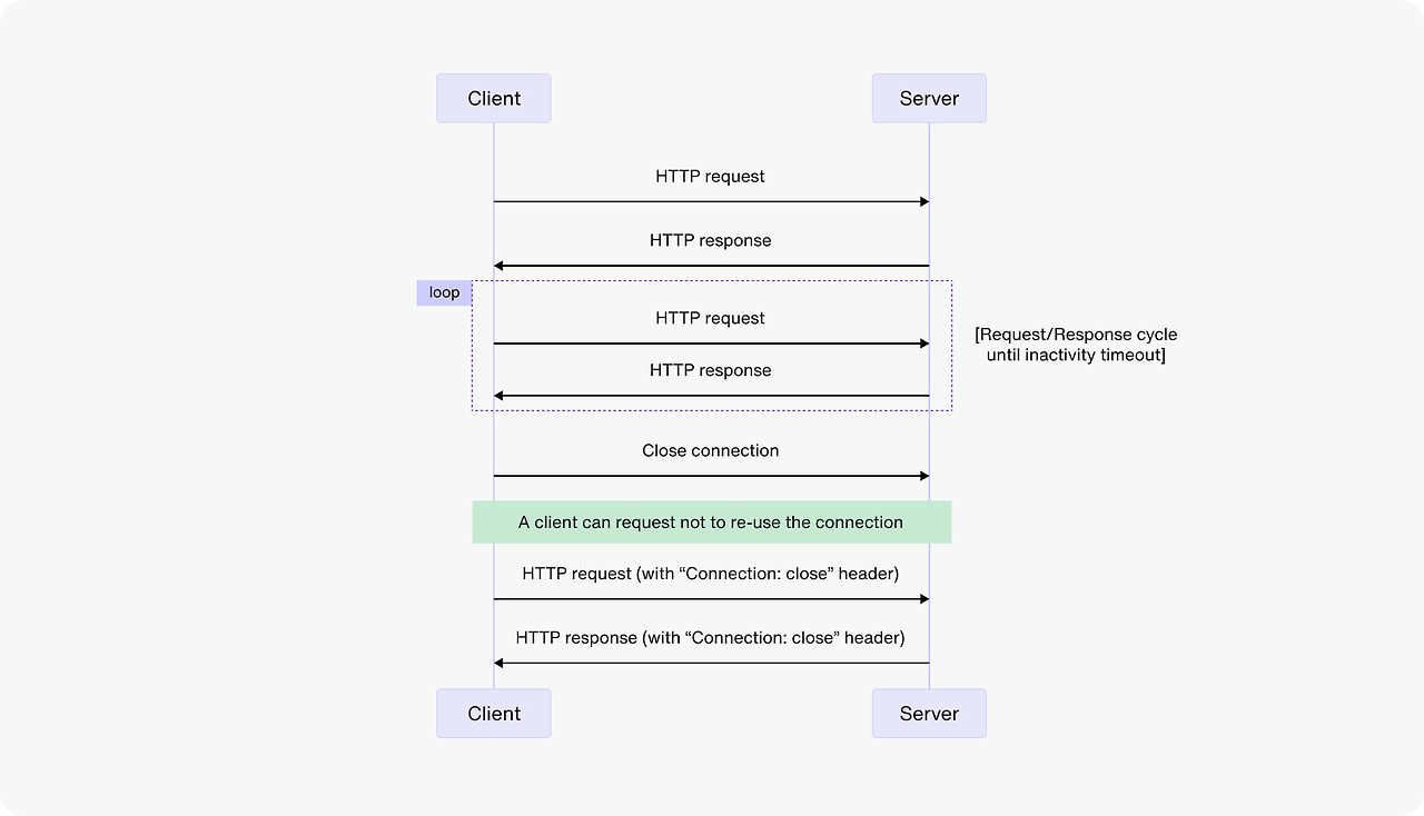 전통적인 HTTP 연결에서는 클라이언트가 요청을 하고 서버가 응답을 보낸 후 연결이 닫힌다. 클라이언트에 더 많은 데이터가 필요한 경우 새 연결을 열어야 한다.