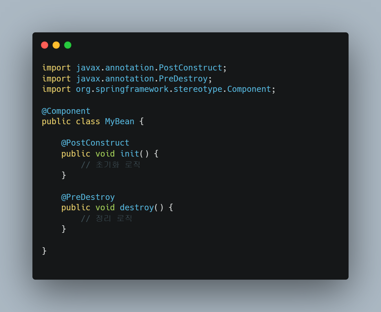 의존성 주입 후 (@PostConstruct), 빈이 소멸되기 전(@PreDestroy) 콜백 메서드에 선언하면 된다.