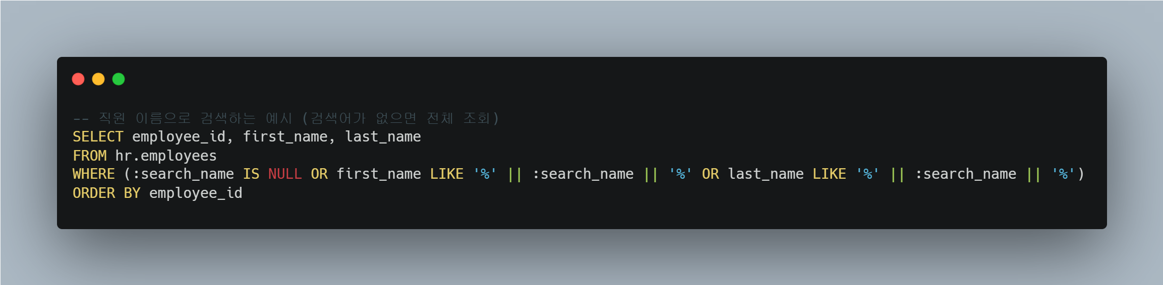 바인드 변수 :search_name을 사용하여 검색어를 입력받는다.