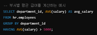 department_id별로 그룹화한 후 HAVING 절을 사용하여 평균 급여가 5000 이상 인 부서만 선택한다.