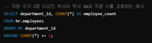 HAVING 절은 GROUP BY로 그룹화된 결과에 조건을 적용할 때 사용한다.