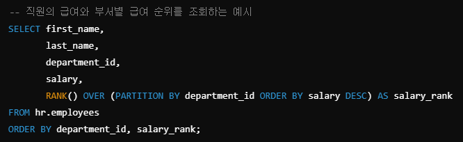 - RANK() 분석 함수를 사용하여 부서별 급여 순위를 계산한다.