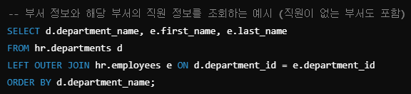 | FULL OUTER JOIN | 두 테이블의 모든 행을 반환하며, 조인 조건을 만족하지 않는 경우 NULL로 표시 | |