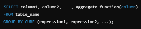 - CUBE는 지정한 표현식의 모든 조합에 대한 집계를 계산한다.