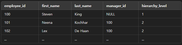 - manager_id IS NULL인 직원(최고 관리자)을 루트 노드로 시작한다.