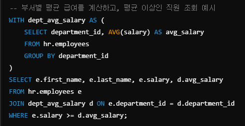 - dept_avg_salary 서브쿼리는 부서별 평균 급여를 계산한다.