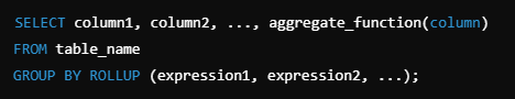 - 예를 들어, ROLLUP (a, b, c)는 다음과 같은 집계를 생성한다.