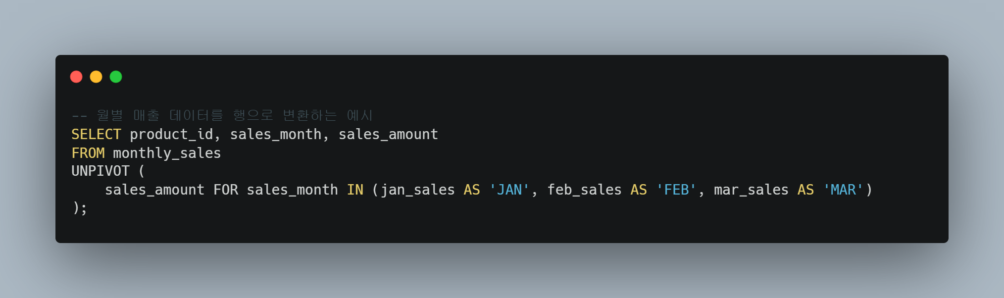 - monthly_sales 테이블에서 각 월의 매출 열을 행으로 변환한다.