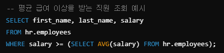 - 메인 쿼리는 직원의 급여와 부서별 평균 급여를 비교하여 평균 이상 인 직원을 조회한다.
