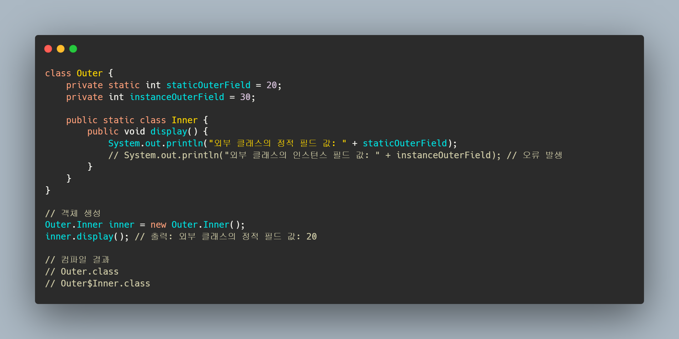 - 외부 클래스의 정적 멤버에만 접근할 수 있으며 인스턴스 멤버에는 접근할 수 없다.