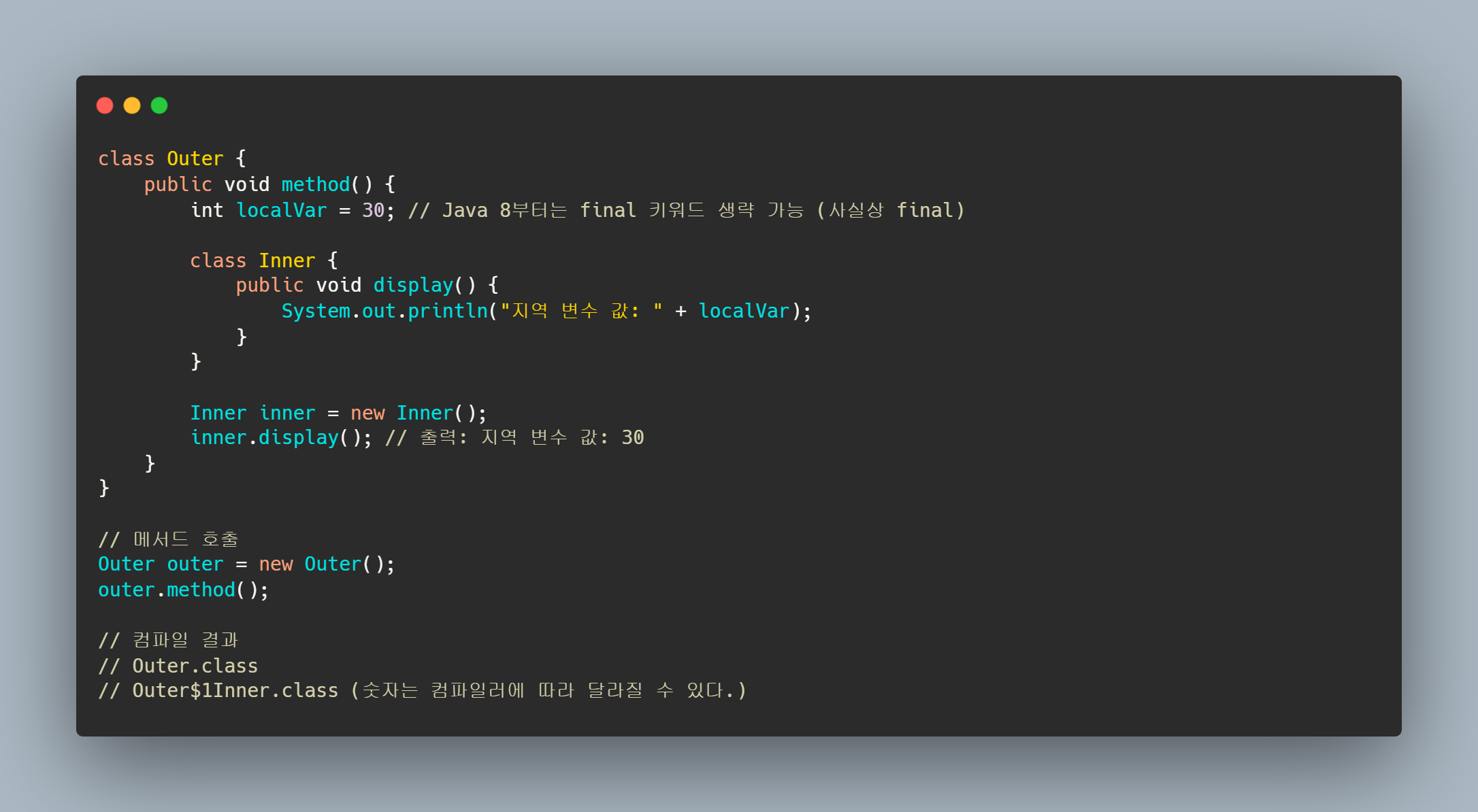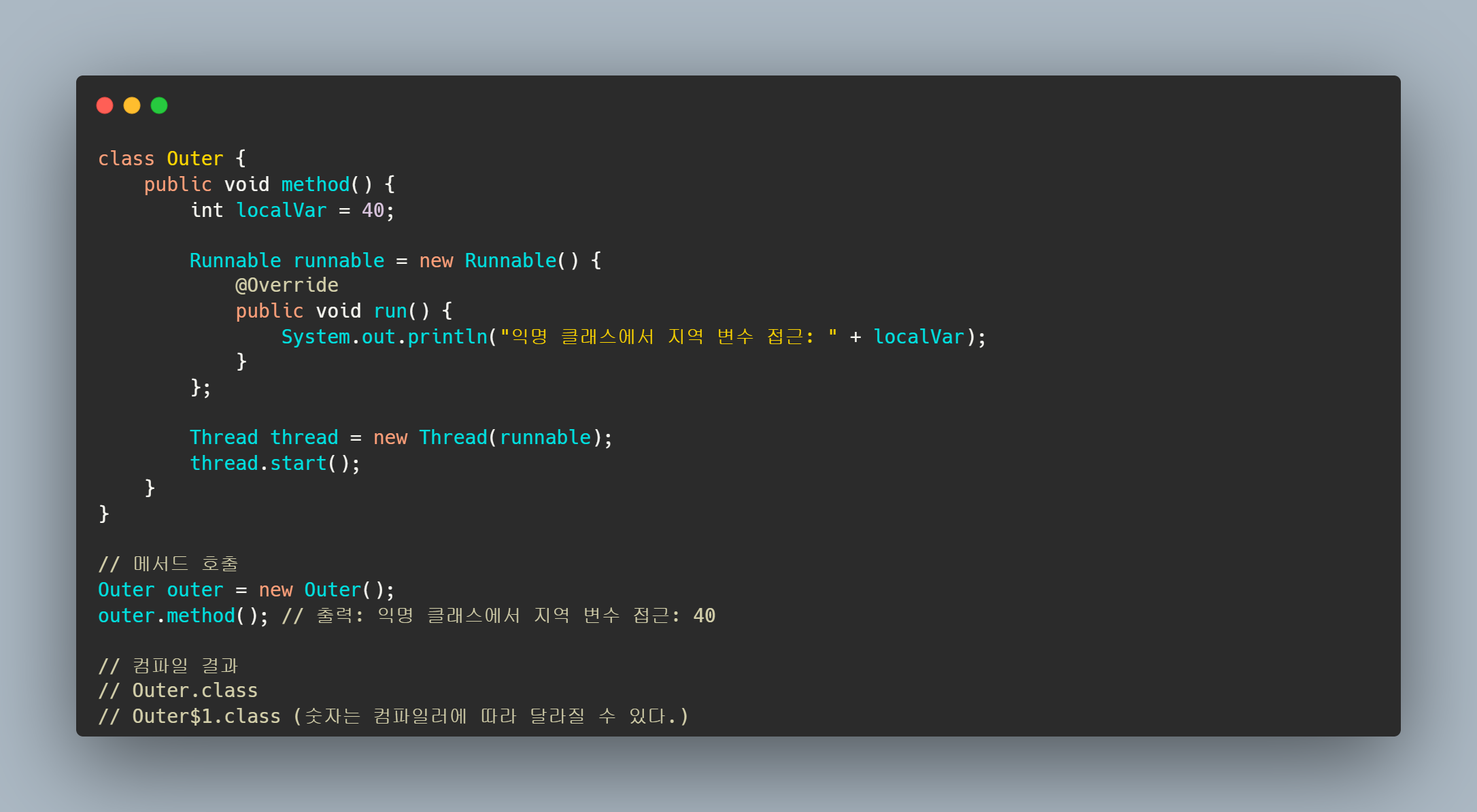 - 외부 클래스의 멤버뿐만 아니라, 감싸고 있는 메서드의 로컬 변수에도 접근할 수 있다.