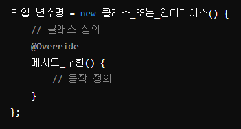- 익명 클래스는 생성자를 가질 수 없으며 하나의 클래스나 인터페이스만 구현할 수 있다.