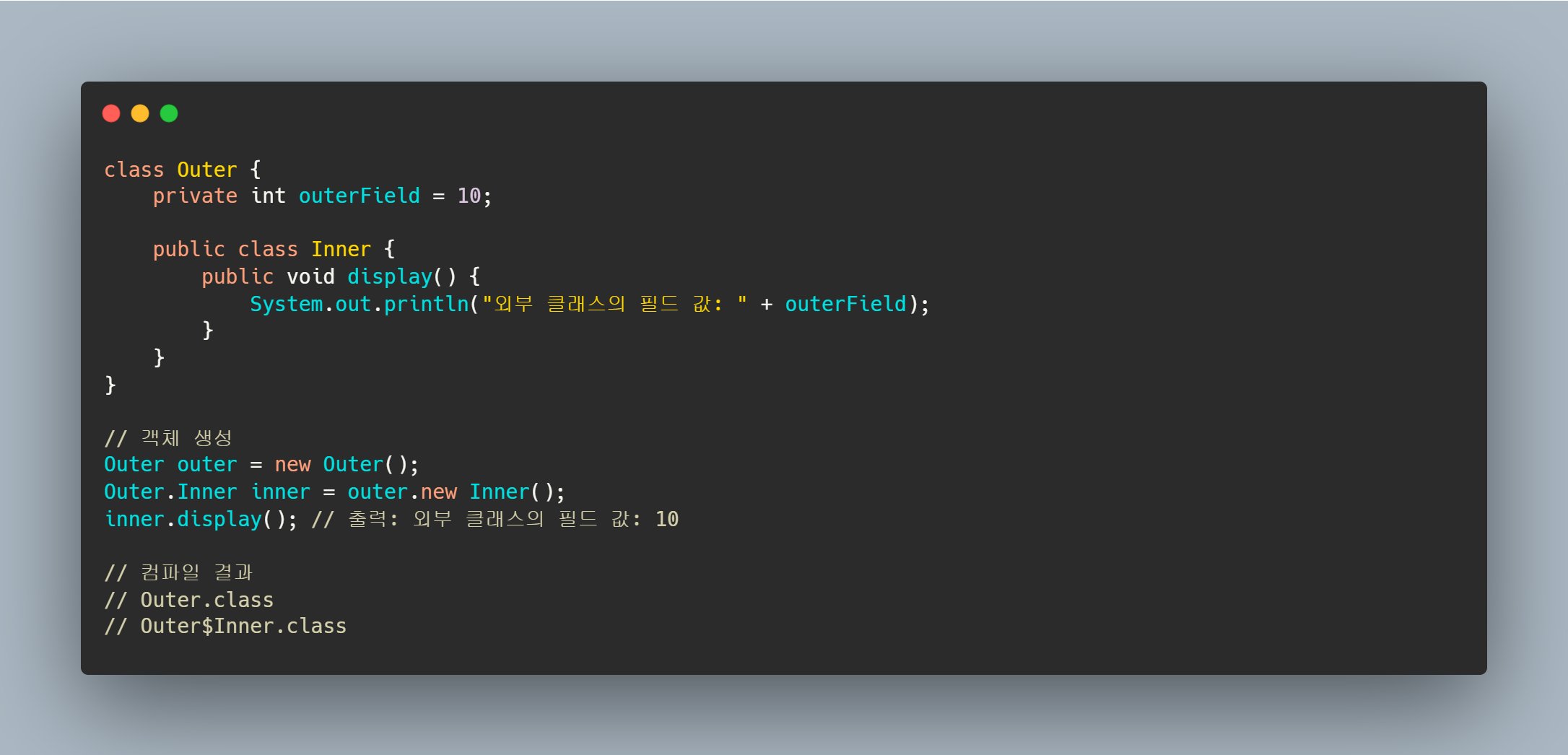 - 외부 클래스의 인스턴스를 생성한 후에 내부 클래스의 인스턴스를 생성할 수 있다.