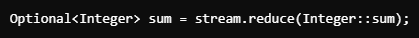 - reduce(BinaryOperator): 초기값 없이 리덕션 수행, 결과는 Optional로 반환.