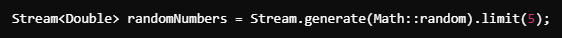 무작위 값이나 동일한 값을 반복 생성할 때 사용하며 본질적으로 무한 스트림이므로 limit()를 사용하여 크기를 제한해야 한다.