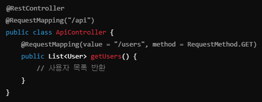 HTTP GET/POST/PUT/DELETE 요청을 특정 메서드에 매핑한다.
