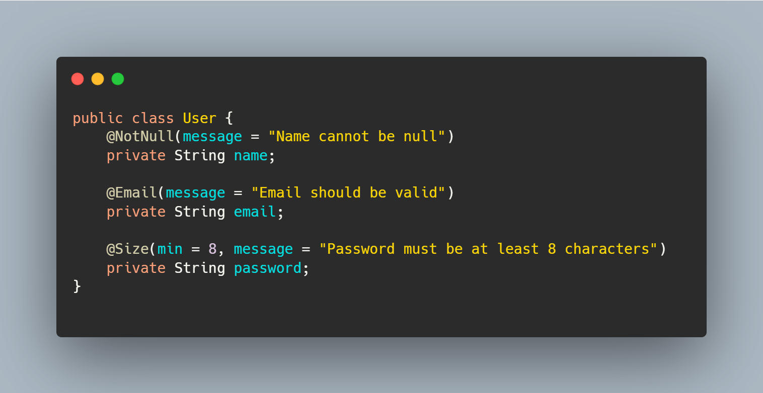 객체의 필드에 대한 유효성 검증 제약 조건을 지정한다.