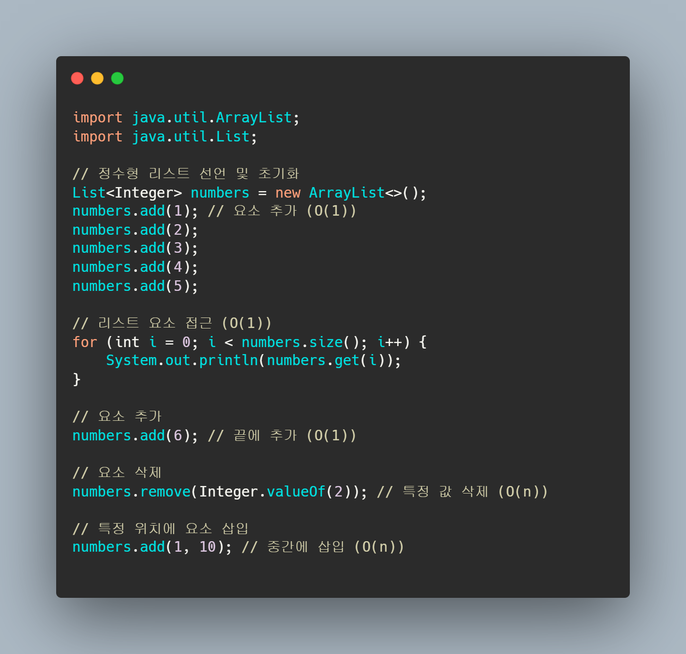 | -- 끝에 추가/삭제 | O(1) | 평균적으로 O(1), 배열 크기 증가 시 O(n) 시간 소요 |