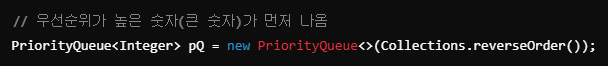 높은 숫자(큰 숫자)가 먼저 나오도록 하려면 Collections.reverseOrder()를 사용하여 최대 힙(max-heap) 구조로 변경할 수 있다.