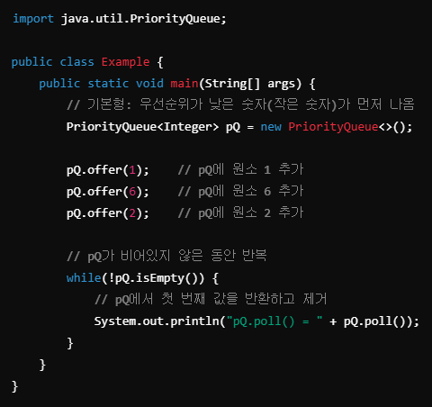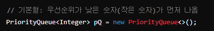 - 우선순위 큐에 null 요소를 추가할 수 없다.
