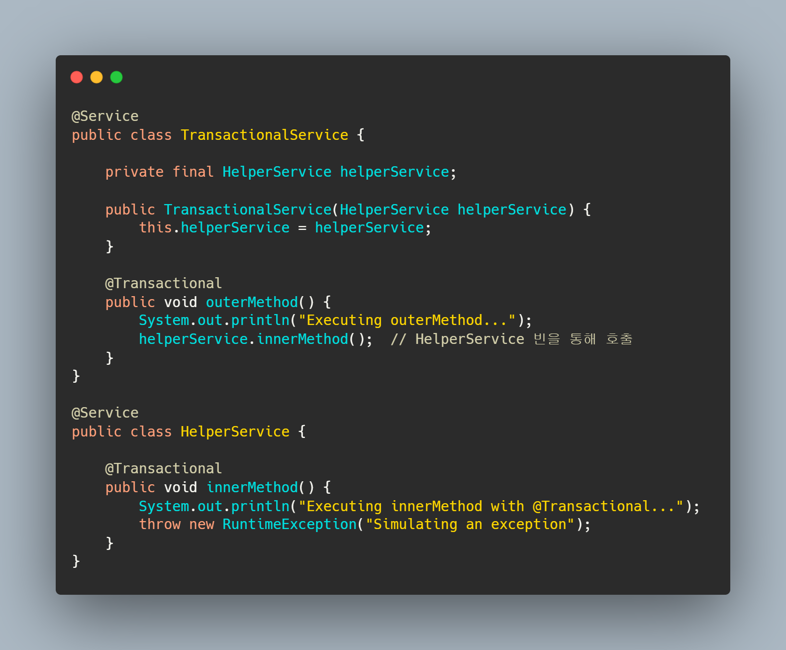 HelperService라는 별도의 빈을 생성하고 innerMethod를 해당 빈에서 호출하도록 변경했다. 이러면 HelperService는 프록시 객체로 트랜잭션 기능을 수행하며 innerMethod가 호출될 때 트랜잭션이 올바르게 적용된다.