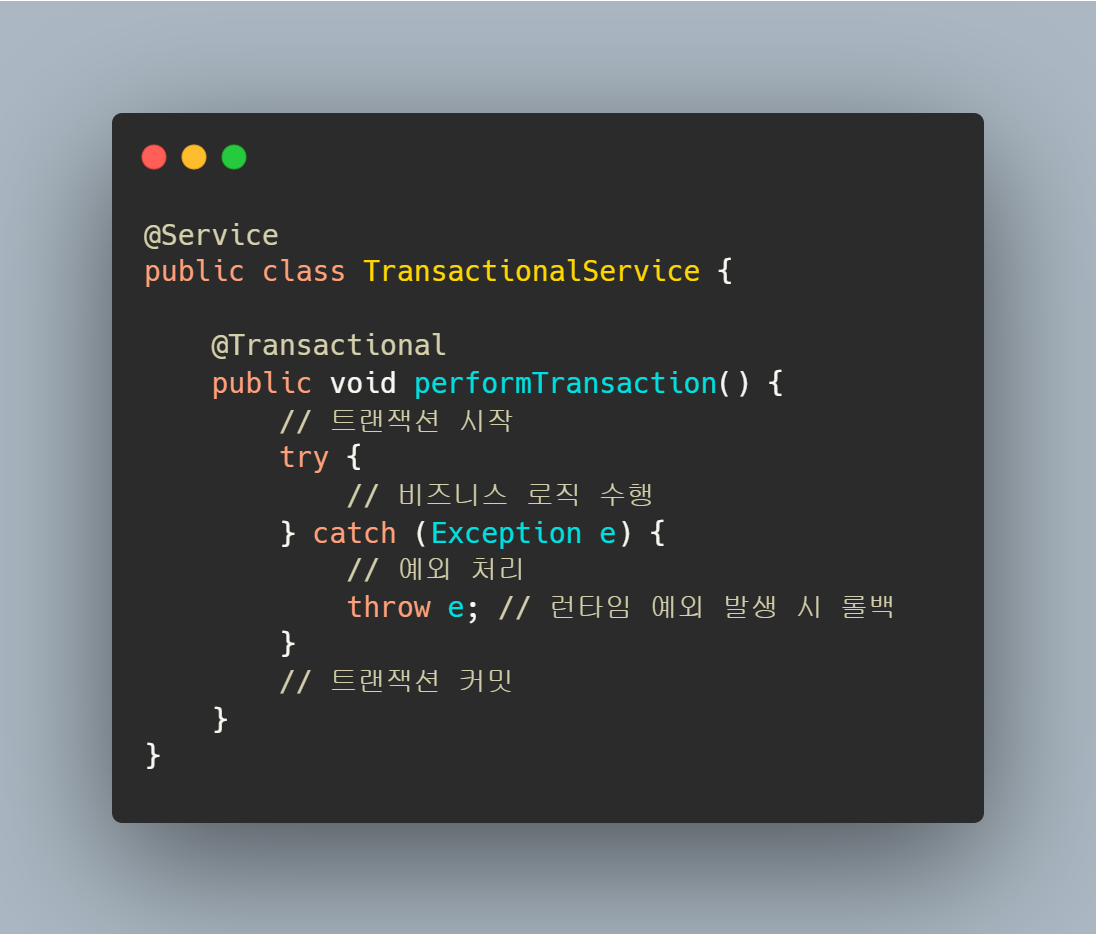 @EnableTransactionManagement 어노테이션을 사용하여 트랜잭션 관리를 활성화하고 @Transactional을 메서드 또는 클래스에 선언하여 트랜잭션을 적용하면 된다.