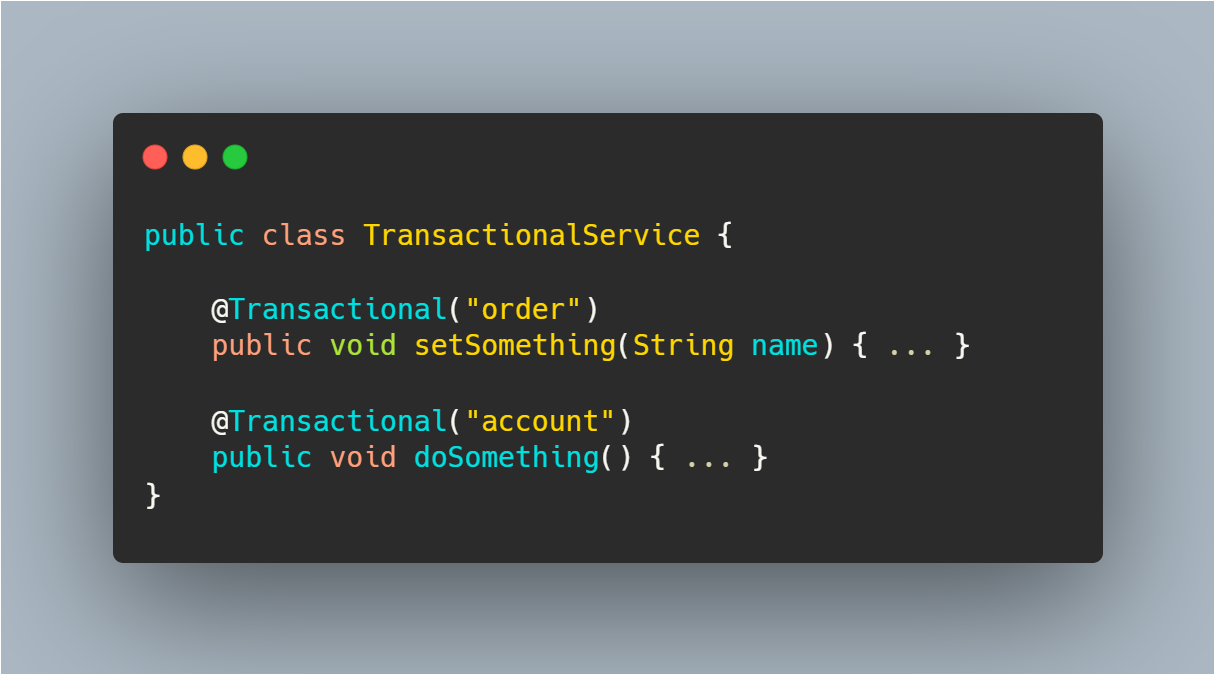 스프링은 하나 이상의 PlatformTransactionManager를 사용할 수 있다. @Transactional("managerName")을 통해 특정 트랜잭션 매니저를 지정할 수 있다. 일반적으로 서로 다른 데이터 소스(예: order DB, account DB)에 대해 별도 매니저를 설정할 때 사용된다.