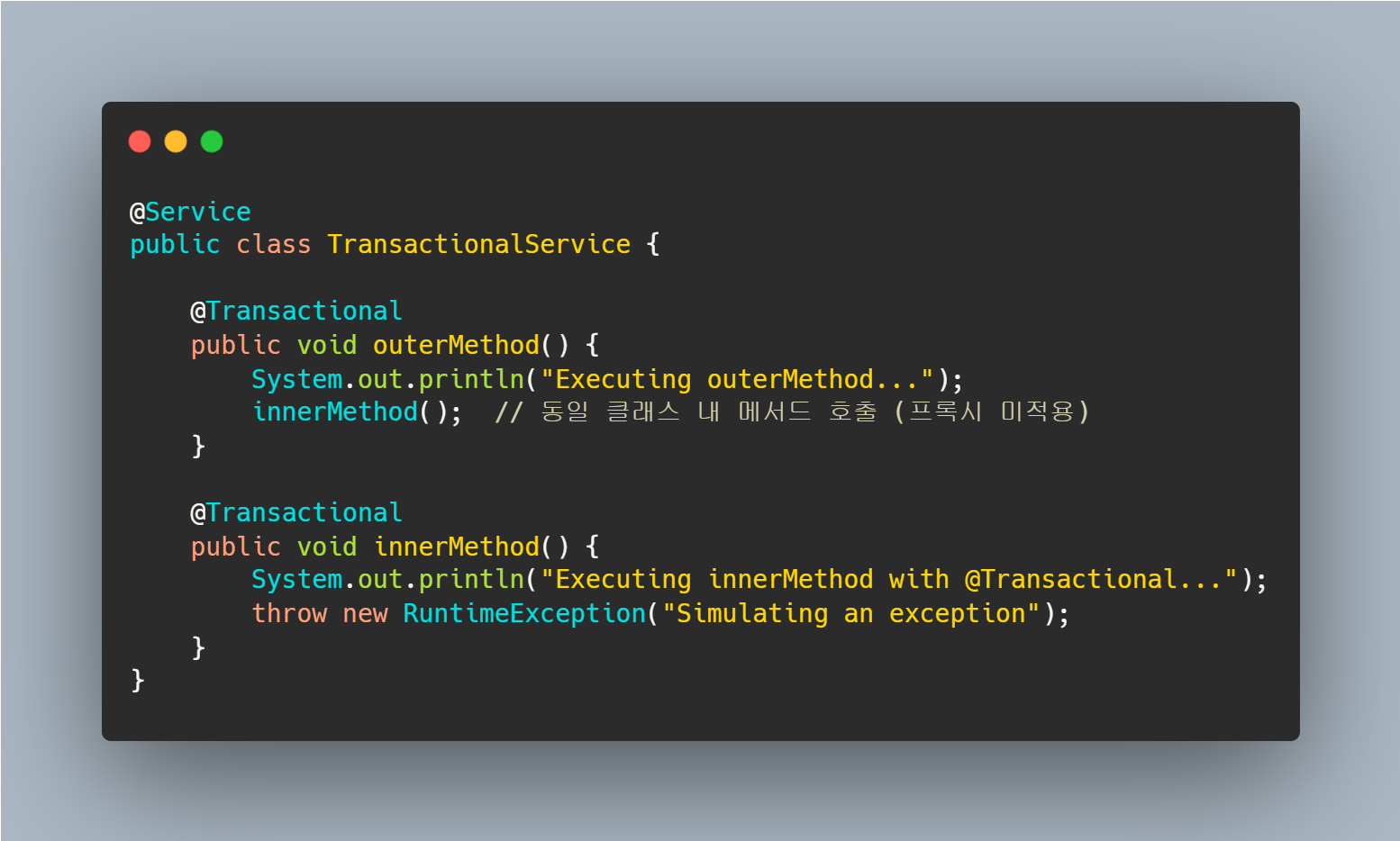 outerMethod가 호출될 때 innerMethod를 내부적으로 호출하지만 innerMethod는 this.innerMethod()로 호출되기 때문에 프록시를 거치지 않는다. 따라서 innerMethod에 적용된 @Transactional이 동작하지 않고 트랜잭션이 적용되지 않는다.
