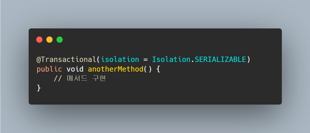 | SERIALIZABLE | 가장 높은 수준의 격리로, 트랜잭션을 직렬화하여 동시 실행을 방지한다. |