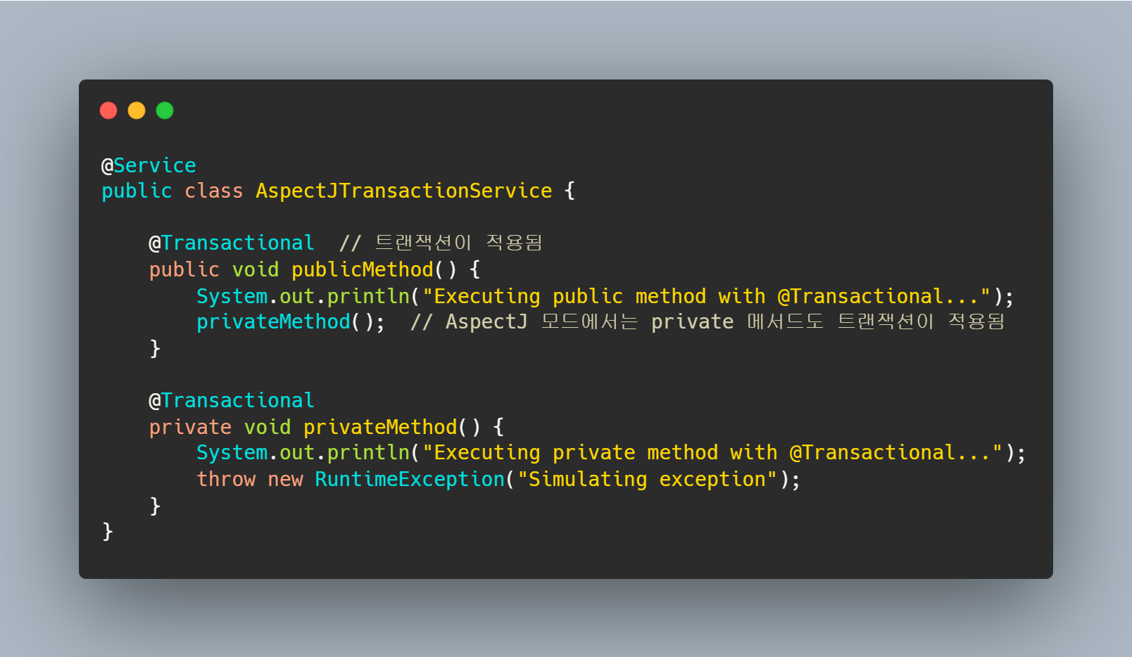 @Transactional은 기본적으로 public 메서드에서만 적용된다. 즉, private, protected, package-private 메서드에서는 동작하지 않는다. public 접근 제어자가 아닌 메서드에 트랜잭션을 적용하려면 AspectJ 모드를 사용해야 한다.